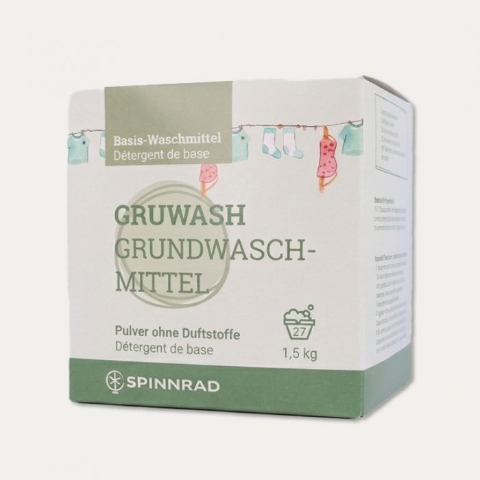 Gruwash ist schon bei 30°C effektiv und als Basis für jedes individuell zusammengestellte Waschmittel geeignet. Es überzeugt außerdem durch einen integrierten Vergrauungsschutz und enthält weder Phosphate, Duftstoffe, Bleichmittel oder optische Aufheller.
