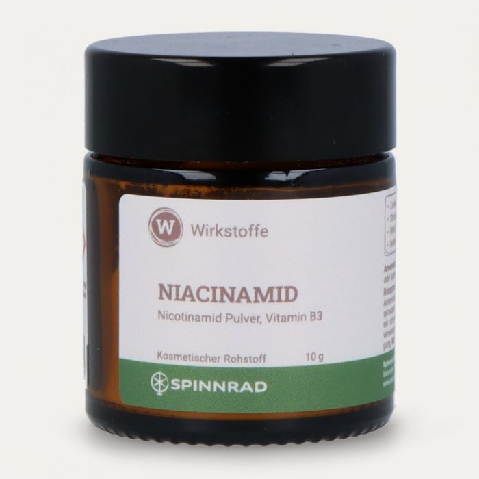 Niacinamid (auch: Nicotinamid) ist ein Bestandteil des B3-Vitamins. In der Kosmetik wird es als Rohstoff verwendet, mit dem du Cremes, Lotionen, Seren und weitere Basisstoffe für die Pflege deiner Haut anreichern kannst.