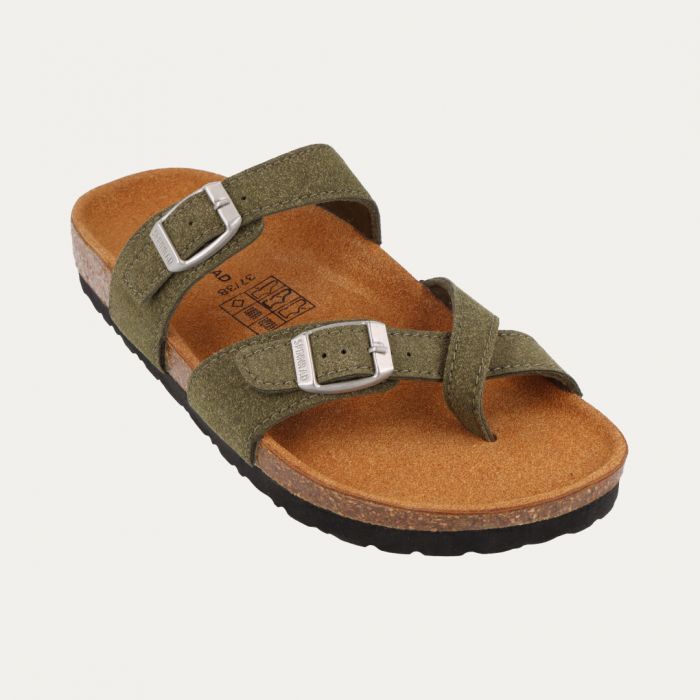 Zimt-Kork Latschen mit Zehenschlaufe aus Wildlederimitat, Hellgrün