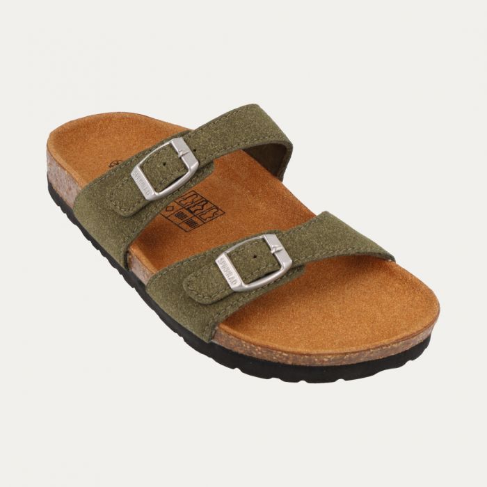 | USP | Hellgrüne Zwei-Riemen-Sandale mit Zimt-Sohle für natürlichen Laufkomfort |