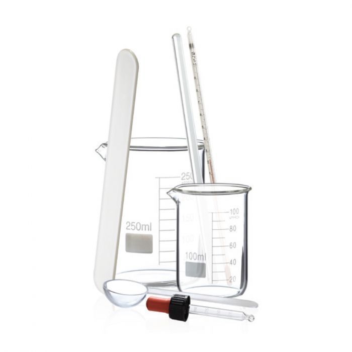 Ein Zubehör-Set enthält zwei Bechergläser (150 ml und 250 ml), einen Glasrührstab, einen Kunststoffspatel, eine Tropfpipette, einen Messlöffel, ein Thermometer und unsere Broschüre „Kosmetik zum Selbermachen“.